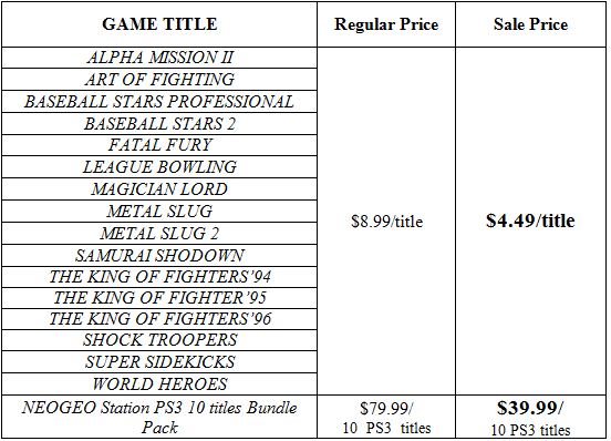 Here is a complete list of all SNK PLAYMORE NEOGEO Station titles(PS3™ Ver.) included in the January PlayStation®Store sale promotion: