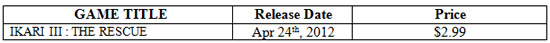 SNK PLAYMORE USA CORPORATION (Corporate HQ: Suita-city, Osaka, Japan, Company President: Ryo Mizufune) is proud to announce the North & South American release of new nostalgic SNK Arcade Classics “IKARI III: THE RESCUE” as a PlayStation® minis title on PSP® (also compatible with PS3™), via the “New Releases” category and the “SNK NEOGEO” Featured Publishers page available on the PlayStation®Store, from Tuesday, April 24th, 2012.
